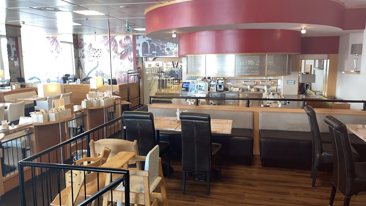 Mit dem Lift kommt man in das erste Stockwerk des Cafés gleich links vom Lift heraus. Rechts vom Lift befindet sich eine sehr große Terrasse mit vielen großen und kleinen Tischen! Wenn man die Innenräumlichkeiten des Cafés betrifft hat man einen sehr sehr sympathischen Eindruck von diesem Café, es stimmen die Proportionen, es das Design, es stimmt die Betischung und die Bestuhlung, es stimmt einfach Alles! Wenn man kurz nach dem Eingangsbereich rechts auf den erhöhten Gästebereich raufgeht kommt ein bisschen weiter rauf zu den Gästetoiletten die immer in sehr sauberen hygienischem Zustand sind, wenn man auf die linke Seite nach dem erhöhten Gästebereich geht kommt man in den sehr großen Spielraum für Kinder davor befinden sich Kinderhochstühle ! Die Speißen hier bzw. Essen ist ausgezeichnet es wird zwar nicht eine allzu große Auswahl an Speisen geboten, dafür aber sind die geboten Speisen außergewöhnlich gut zum weiterempfehlen! Das Personal ist sehr angenehm und überaus freundlich und sehr hilfsbereit!